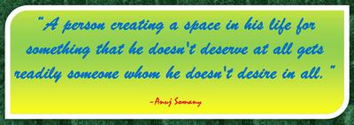 “A person creating a space in his life for something that he doesn't deserve at all gets readily someone whom he doesn't desire in all.”~Anuj Somany